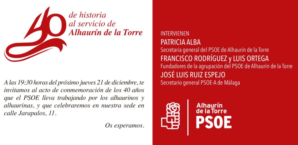 El PSOE cumple 40 años en Alhaurín de la Torre tras su fundación por un grupo de personas visionarias y progresistas durante el Festival de la Torre del Cante del año 1977. Desde ese momento, los socialistas llevamos cuatro décadas trabajando por el bienestar y los derechos de los alhaurinos y de las alhaurinas, la razón de ser de nuestra lucha socialista. Para celebrar nuestro 40 aniversario queremos invitarte al acto de conmemoración que tendrá lugar el jueves 21 de diciembre a partir de las 19.30 horas en la Casa del Pueblo, en calle Jarapalos, 11. Allí te esperamos.